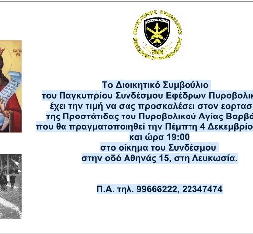 Το Διοικητικό Συμβούλιο του Παγκυπρίου Συνδέσμου Εφέδρων Πυροβολικού εύχεται σε όλους τους Πυροβολητές και σε όλο τον κόσμο