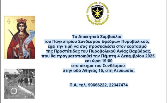 Το Διοικητικό Συμβούλιο του Παγκυπρίου Συνδέσμου Εφέδρων Πυροβολικού,έχει την τιμή να σας προσκαλέσει στον εορτασμότης Προστάτιδας του Πυροβολικού Αγίας Βαρβάρας,που θα πραγματοποιηθεί την Πέμπτη 4 Δεκεμβρίου 2025 και ώρα 19:00στο οίκημα του Συνδέσμουστην οδό Αθηνάς 15, στη Λευκωσία. Π.Α. τηλ. 99666222, 22347474